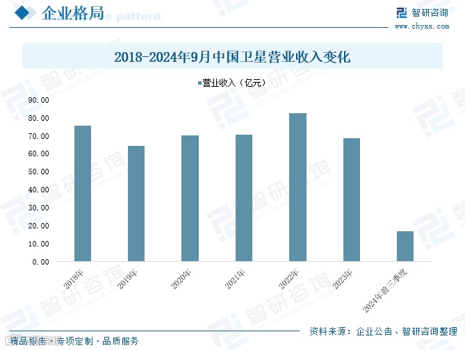 在宇航制造领域,公司开发了CAST10至CAST4000系列小/微小卫星平台,产品广泛应用于海洋监测、灾害预警、遥感测绘等领域,累计成功发射近180颗卫星。在卫星应用方面,提供卫星通信、导航、遥感、智慧城市、信息安全等综合解决方案。2024年前三季度营收16.74亿元,同比下降54.41%。