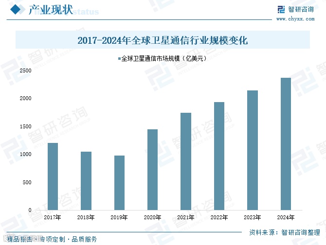 卫星通信通过人造地球卫星作为中继站实现远距离通信,该构想最早由英国物理学家A.C.克拉克于1945年提出,并于20世纪60年代实现商用。1957年苏联发射首颗人造卫星,标志着卫星通信进入实际应用阶段。21世纪以来,随着技术进步与成本下降,行业发展加速。2024年全球卫星通信市场规模已突破2000亿美元。