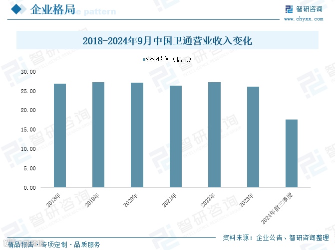 中国卫通集团股份有限公司成立于2001年,2019年在上交所上市(股票简称“中国卫通”),是中国航天科技集团旗下核心卫星运营企业,具备基础电信与增值电信业务经营资质,是我国唯一拥有自主可控通信卫星资源的基础电信运营商,列属国家一类应急通信保障队伍。公司运营管理18颗民商用通信广播卫星,覆盖中国全境及亚太、中东、非洲、欧洲等地。2024年前三季度营收17.58亿元,同比下降5.57%。