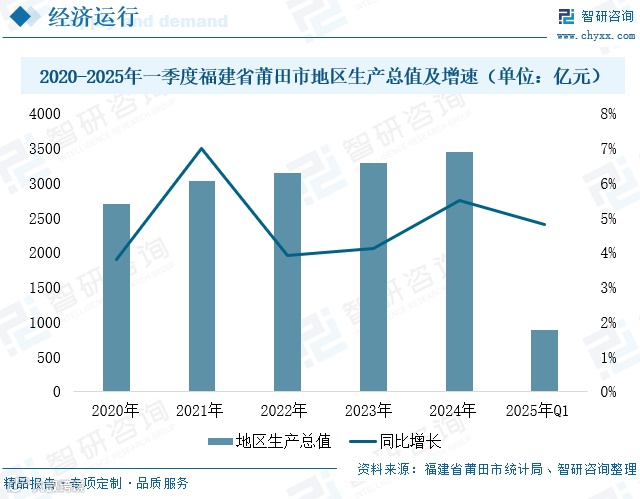 莆田市地处闽中,是长三角与珠三角之间的战略衔接枢纽,近年来锚定“和美莆田、共同富裕”目标,实施“一五二三四”工作体系,加快构建绿色高质量发展格局。2024年全市地区生产总值达3442.74亿元,同比增长5.5%,三次产业结构优化为4.4:46.8:48.8,第二产业贡献率超50%。2025年一季度GDP达885.90亿元,同比增长4.8%,其中第二产业增长6.5%,展现出强劲的产业升级动能。