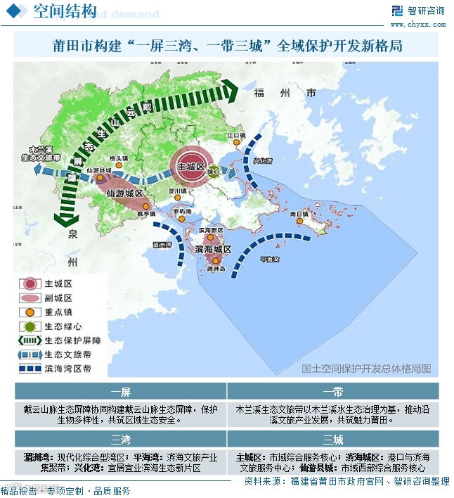 依据《莆田市国土空间总体规划(2021–2035)》,构建“一屏三湾、一带三城”总体格局:“一屏”为戴云山脉生态屏障,“三湾”为湄洲湾、平海湾、兴化湾差异化发展湾区经济,“一带”为木兰溪生态文旅带,“三城”为城区功能互补协同发展。