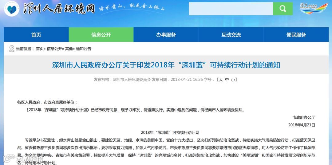 4月21日,深圳市人居环境委员会再次在官网发出《2018年「深圳蓝」可持续行动计划》。