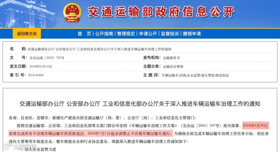 按照《车辆运输车治理工作方案》要求,在2018年6月30日前,全面完成所有不合规车辆运输车的更新改造。从2018年7月1日起,全面禁止不合规车辆运输车通行,符合《汽车、挂车及汽车列车外廓尺寸、轴荷及质量限值》(GB1589-2016)要求的标准化车辆运输车比重达到100%。