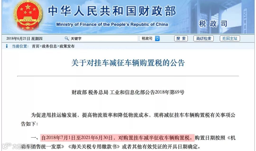 为促进甩挂运输发展,提高物流效率和降低物流成本,财政部、国家税务总局、工业和信息化部等三部门31日联合发布公告,自2018年7月1日至2021年6月30日,对购置挂车减半征收车辆购置税。