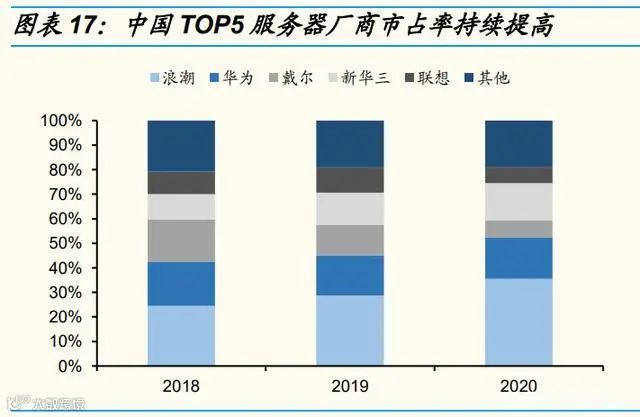 伴随服务器芯片功耗上升,对高功率电源需求增加,推动单价以约10%年增速上涨。全球TOP5服务器厂商(戴尔、HPE、浪潮等)市占率稳定在50%左右,中国前五厂商市占率达81.2%,高度集中格局利于大陆电源企业切入供应链。