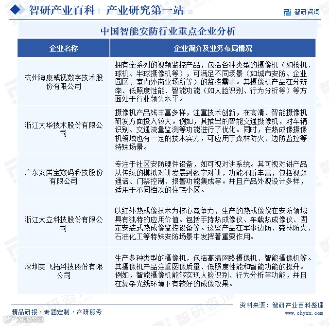 海康威视、大华股份等龙头企业凭借技术实力与完整产品线占据主导地位,覆盖视频监控、出入口控制、防盗报警等多个领域,在国内外市场具备较强影响力。安居宝、大立科技、英飞拓等企业在细分领域通过差异化策略参与竞争,形成多层次市场竞争格局。