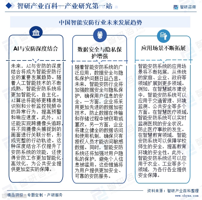 未来我国智能安防行业将呈现三大趋势:一是AI与安防深度融合,通过算法优化提升视频识别与预警能力;二是数据安全与隐私保护将被高度重视,企业将采用更强加密技术与访问控制机制;三是应用场景持续拓展,从传统安防延伸至智慧城市、智慧医疗、智慧教育等领域,构建全方位安全保障体系,助力社会安全与稳定发展。