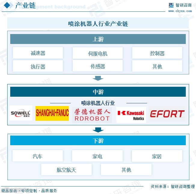喷涂机器人产业链上游主要包括减速器、伺服电机、控制器、传感器等核心零部件及基础材料,其中核心部件技术门槛高,直接影响机器人的性能与稳定性。中游为机器人本体制造环节,企业整合上游零部件进行整机生产。下游广泛应用于汽车、家电、家具、航空航天等领域,已成为现代工业制造的关键装备。