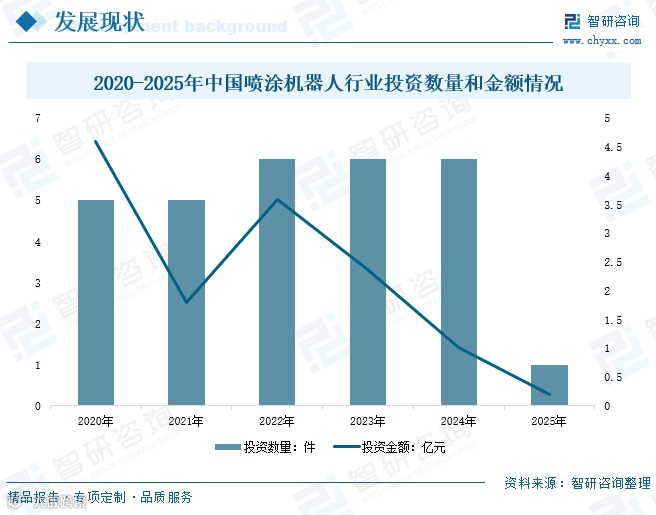 投融资方面,2020—2024年行业投资事件数量从5起增至6起,但投资金额由4.6亿元下降至1.02亿元,反映出资本趋于理性。截至2025年4月2日,慧为科技完成Pre-A轮融资,由彬复资本投资。该公司以“飞鱼机器人”品牌为核心,聚焦下一代工业机器人控制、离散伺服驱动等技术,产品涵盖喷涂、激光切割、防爆、洁净、医疗无菌、低温、真空机器人七大类。