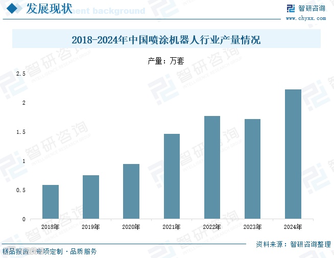 随着制造业升级和劳动力成本上升,喷涂机器人凭借高效、精准的优势,在汽车、航空航天、电子等行业应用不断深化。政策层面,税收减免、资金补贴和技术支持等举措为行业发展营造良好环境。产量方面,2018年至2024年中国喷涂机器人产量总体呈上升趋势,从0.59万套增至2.23万套;2023年因下游需求放缓同比下降2.8%,2024年恢复增长。