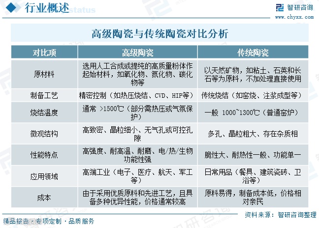 相较于传统陶瓷(如日用瓷、建筑瓷),高级陶瓷采用Al₂O₃、Si₃N₄等人工合成原料,经精密工艺加工,具有高强度、耐高温、导电性可控、生物相容等优势,广泛应用于电子、医疗、航空航天等领域。而传统陶瓷以天然黏土为原料,性能单一,主要用于日常用品和建筑领域。两者在成本上差异显著:高级陶瓷因工艺复杂价格较高,传统陶瓷则因规模化生产成本较低。