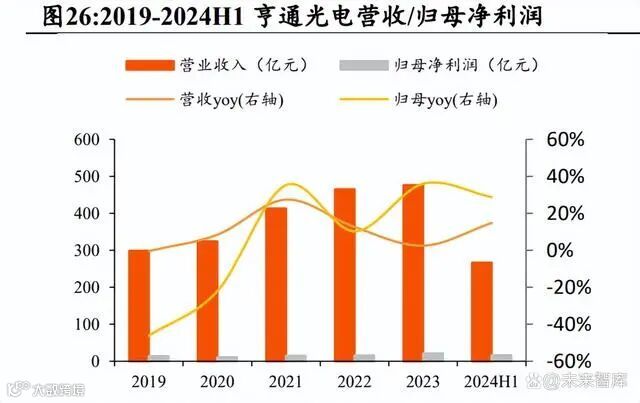 公司聚焦通信与能源领域,提供光通信、智能电网、海洋能源等解决方案。2024H1 实现营收 266.14 亿元,归母净利润 16.09 亿元,同比分别增长 14.83% 和 28.80%。