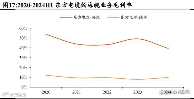 海缆业务毛利率显著高于陆缆。以东方电缆为例,2020-2023 年海缆业务毛利率持续保持在 40%以上,受益于高壁垒带来的议价能力。随着高压化、柔直化趋势深化,技术领先企业有望维持高盈利水平。