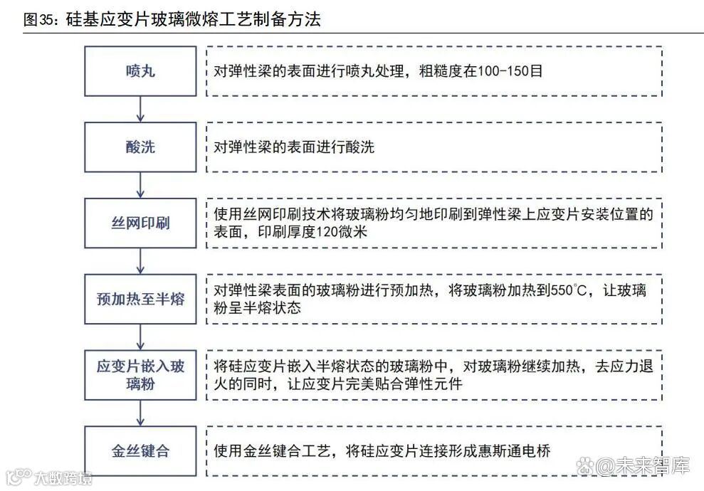 应变片类型影响工艺路线:金属片依赖胶水人工贴片,难以自动化;硅片可结合玻璃微熔工艺实现自动化生产。