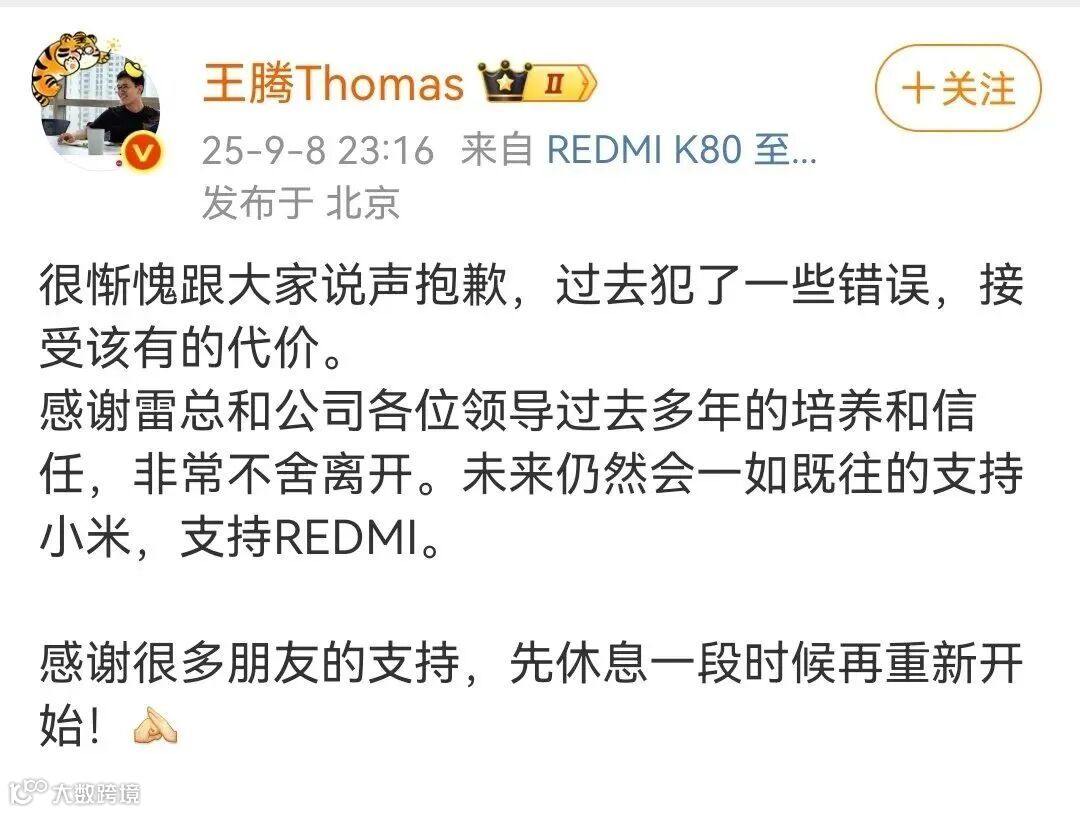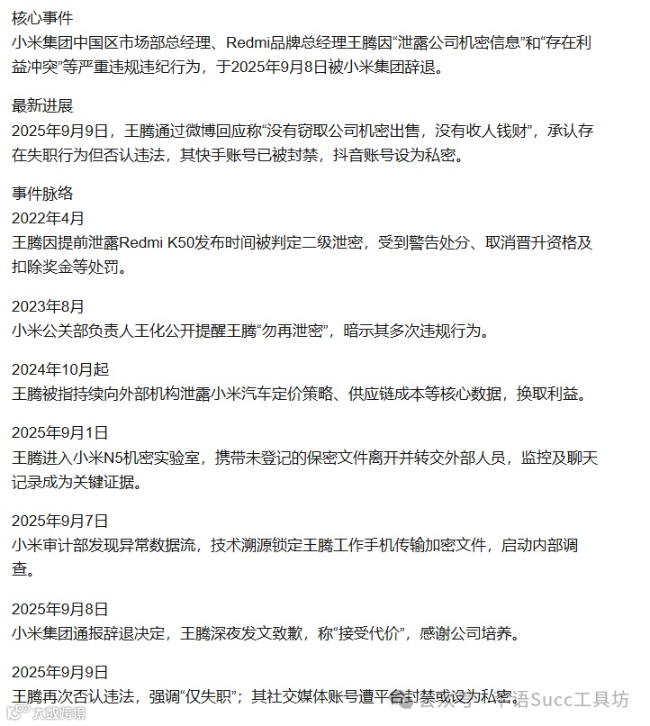 9月8日晚,小米中国区市场部员工王腾因涉嫌“泄露公司机密信息”及“存在利益冲突”被公司辞退。作为曾被外界视为雷军接班人的明星管理者,其迅速陨落引发广泛关注。