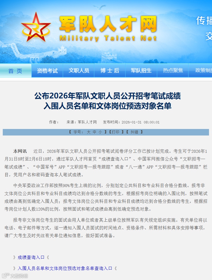 2026年军队文职人员公开招考笔试成绩