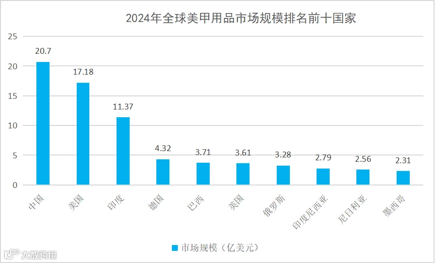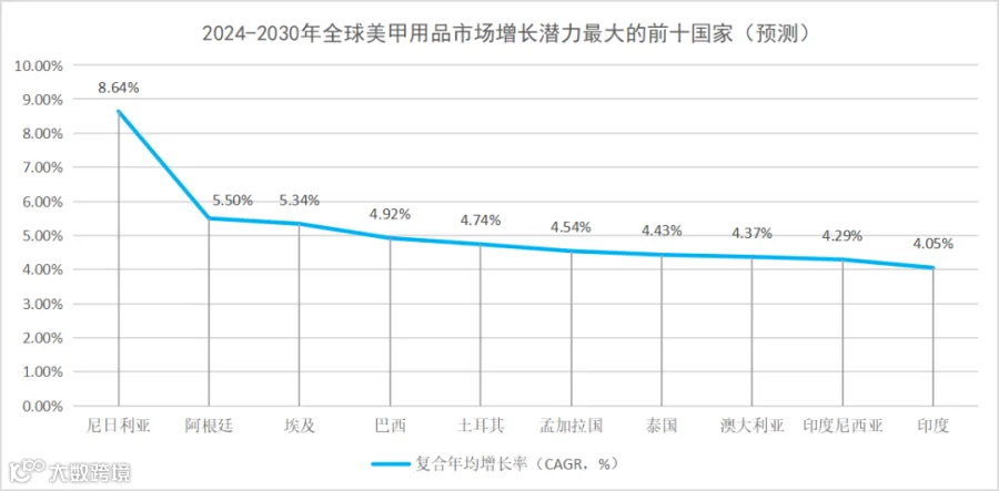 从国家来看,规模前十国家对全球市场贡献近六成。Statista数据显示,2024年美甲用品市场规模前十的国家依次为中国、美国、印度、德国、巴西、英国、俄罗斯、印度尼西亚、尼日利亚、墨西哥,十国合计规模约为71.83亿美元,占全球比重为57.65%。其中,中国、美国、印度分别以20.70亿美元、17.18亿美元、11.37亿美元的市场规模保持领先地位。值得一提的是,规模前十的国家中尼日利亚、巴西、印度尼西亚、印度的增速也大幅领先。作为非洲新兴经济体的尼日利亚在美甲用品规模、增速两方面均较为领先。数据显示,2024年尼日利亚美甲用品市场规模为2.56亿美元,到2030年达4.21亿美元,2024-2030年的复合年均增长率为8.64%。