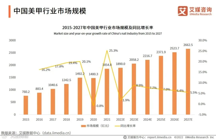 图5 2015-2027年中国美甲行业市场规模及同比增长率(亿元人民币) 数据来源:艾媒咨询 图片来源:艾媒咨询《2022-2023年中国美甲行业》 从细分市场来看,穿戴甲呈现爆发式增长,指甲油电商市场蓬勃发展。穿戴甲细分市场方面,根据共研产业咨询数据,2019-2024年,我国穿戴甲行业市场规模从4.33亿元暴增至92.29亿元,期间复合年均增长率为84.39%。到2028年,市场规模将进一步增至640.71亿元,2024-2028年的复合年均增长率为62.32%。指甲油细分市场方面,魔镜市场情报统计的数据显示,2022年9月至2023年8月,三大主流电商平台(淘宝、京东、抖音)指甲油产品合计销量超921.74万件,销售额破亿,达2.42亿元。值得一提的是,IP联名为美甲用品市场注入增长新动能。据《每日经济新闻》报道,一款《王者荣耀》定制美甲价格高达5000元。近期爆火的LABUBU形象也被定制成美甲,售价在千元到万元不等。 2、本土品牌在电商市场崭露头角,企业集聚在东部沿海 从市场竞争格局来看,在穿戴甲出现前,C端消费者购买的美甲用品主要为指甲油,且更加青睐海外美妆大牌产品,不过一些本土美甲品牌在电商市场占据一席之地。Statista数据显示,2022年我国美甲用品市场主要被海外美妆品牌主导。其中,香奈儿、迪奥两大美妆品牌凭借高端指甲油产品线占据国内美甲用品大部分市场份额,合计市占率为77%,占比近八成。在指甲油电商市场,Miss Candy、Vcnd Bluesky等本土指甲油品牌崭露头角。魔镜洞察数据显示,2022年9月至2023年8月,Miss Candy在京东和抖音的销售额合计超2000万元。同期,Vcnd Bluesky在淘宝天猫的销售额为1213.57万元。穿戴甲细分市场中本土品牌凭借款式丰富、价格平价等优势更受消费者青睐。例如,2025年抖音618大促穿戴甲销售额排名前十的都是本土品牌。其中,排名第一的野世穿戴甲,在618大促期间,抖音销售额超100万元,销量超2.5万副。 从区域分布来看,我国美甲用品企业主要分布在东部沿海,形成了颇具代表性的东海手工穿戴甲产业集群。根据天眼查数据,我国现存美甲企业主要分布在山东、江苏、广东,企业数量依次为13.18万家、11.11万家、10.64万家。作为“世界水晶之都”的江苏东海,通过敏锐洞察碎水晶销量暴涨与穿戴甲的紧密关联,开始涉足美甲行业,逐渐发展成年产值近百亿元的手工穿戴甲产业集群。数据显示,2024年,东海手工穿戴甲已拥有完整从原料生产到设计制造再到销售服务的产业链,总产量突破1.5亿副,年产值突破80亿元,产出的手工穿戴甲约占国内市场份额的70%,并借助跨境电商将8000万副穿戴甲销往全球30多个国家。 3、美甲品牌出海,涌现多个细分赛道新星 随着美甲在海外热度持续走高,不少美甲企业瞄准美甲细分赛道,借助跨境电商,在海外市场声名鹊起。例如,主攻欧美市场的Modelones,从亚马逊平台起家,通过爆款产品DIY美甲全套组件畅销而逐步发展壮大。目前,Modelones年营收预估在200万至500万美元之间。从指甲油赛道切入的Beetles,凭借高频创新和设计时尚等优势,在亚马逊平台圈粉一批消费者。其中,一款打底油在亚马逊的月销量高达30K+,评论超过9W条。来自深圳的品牌——SUNUV则另辟蹊径,瞄准美甲光照赛道,凭借在美甲光照领域的技术领先优势,叠加线上线下相结合的渠道发力,仅一年时间SUNUV就拿下全球美甲灯市场40%的市场份额。相关数据显示,SUNUV单品月营收超过40万美金,多款产品长期霸榜亚马逊BS榜前十,产品销往全球100多个国家。 PART.03 关于我国美甲用品行业未来发展建议 1、重视产品设计创新和优化迭代 根据相关数据,美甲用品的质量和款式设计是消费者最优先考虑的两大因素,其中,渐变美甲、图案美甲、珠光美甲和IP联名等款式颇受消费者青睐。对此,企业应紧跟时尚新趋势,积极引入人工智能、3D打印新技术,环保新材料,油画、金属锻造新工艺等,从设计优化和质量提升等方面下足功夫,以打造出更符合市场需求的美甲用品。 2、合理规划销售渠道策略 从全球美甲用品市场来看,欧美发达市场的线上电商普及率较高,且社媒达人营销带动作用较强,企业布局欧美市场时应重点布局主流跨境电商平台和社媒平台。在发展潜力较大的非洲新兴市场,受限于电商普及率较低,企业可联合当地经销商重点铺设线下销售渠道,抢抓市场机遇。 3、加强美甲出海品牌建设 当前,国内外美甲行业的大品牌多为美妆奢侈大牌,尚未形成专注于美甲赛道的大品牌。我国美甲行业虽然起步晚,但在快速崛起的电商市场加持下,发展迅速,现已形成完善的美甲供应链,产品质量和设计创新方面也颇具优势。政府和行业协会应鼓励更多优势企业加大品牌建设力度,积极拥抱跨境电商新业态,社媒营销新模式,培育出更多美甲出海品牌。 参考文献 1. The Business Research company.《Nail Care Products Global Market Report 2025》.2025-01.https://www.thebusinessresearchcompany.com/report/nail-care-products-global-market-report. 2. Statista.《Market Insights-Consumer-Beauty & Personal Care-Cosmetics-Nails》.2025-02. 3. Global Market Insights.《Nail Care Products Market Size》.2025-03.https://www.gminsights.com/industry-analysis/nail-care-products-market. 4. Statista.《Market Insights-Ecommerce-Beauty & Personal Care-Cosmetics-Nails》.2025-07. 5. Fortune Business Insights.《Nail Care Products Market Size》.2025-08-18.https://www.fortunebusinessinsights.com/nail-care-market-106149. 6. 艾媒咨询.《2022-2023年中国美甲行业:美甲行业全产业链共同