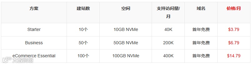起步配置相同:10个网站、免费域名、免费WordPress迁移、免费SSL证书、免费CDN、10 GBNVMe、每月4万次访问、自定义邮箱以及全天候即时在线聊天服务(含电话支持)。