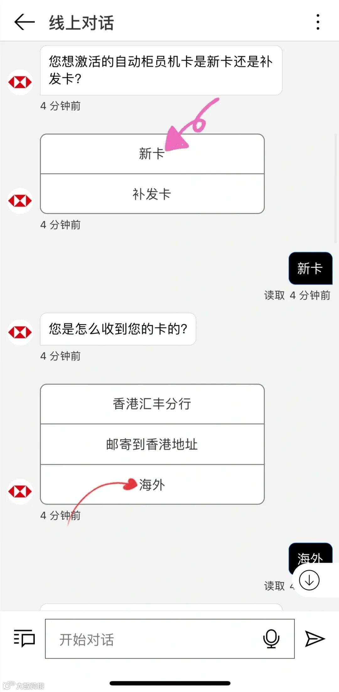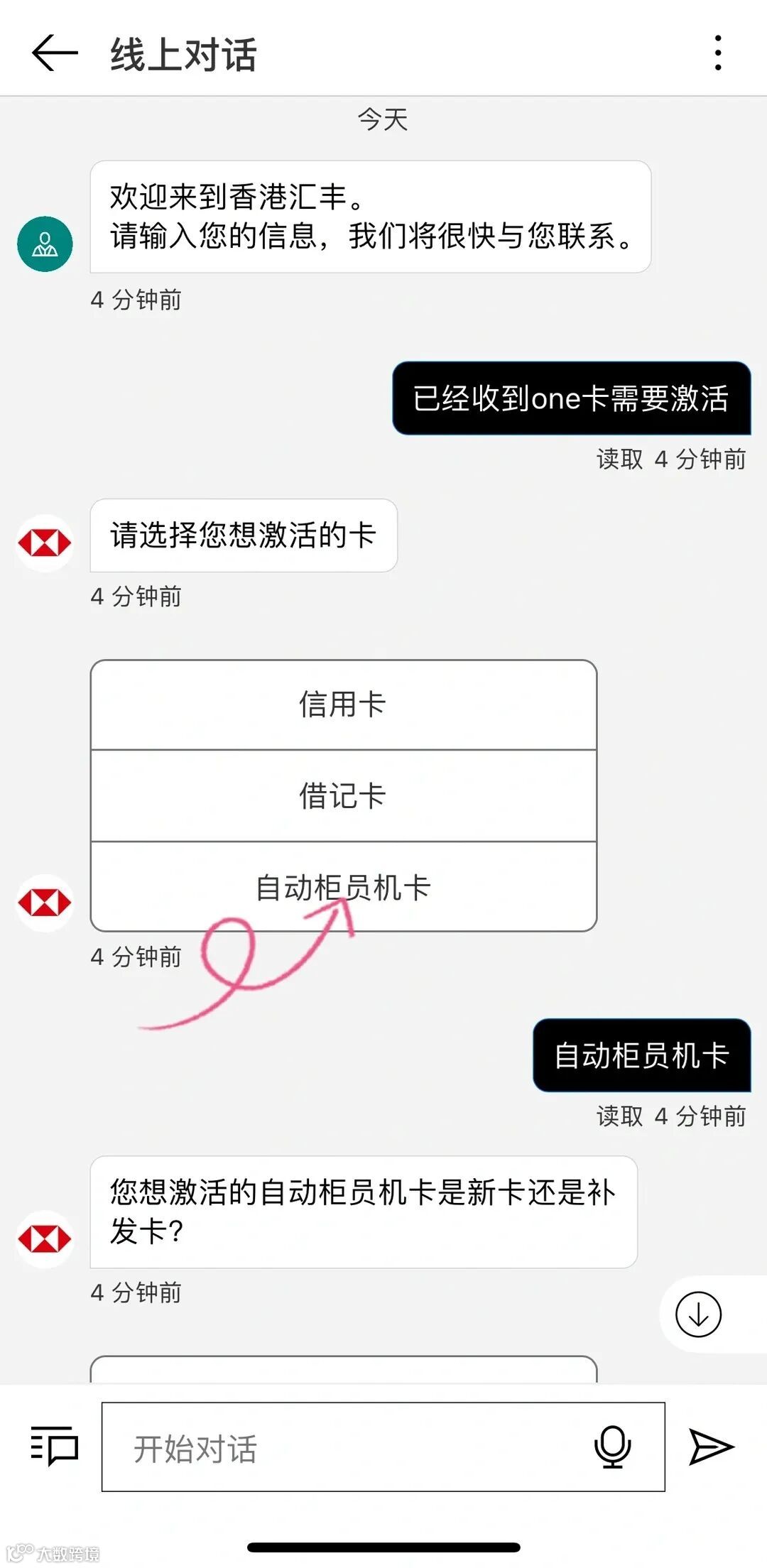 打开汇丰香港APP → 点击右下角【支援】→ 选择顶部【线上对话】→ 输入关键词“激活提款卡”。系统将自动弹出选项,请依次选择:【自动柜员机卡】→ 【新卡】→ 【邮寄至海外】。
