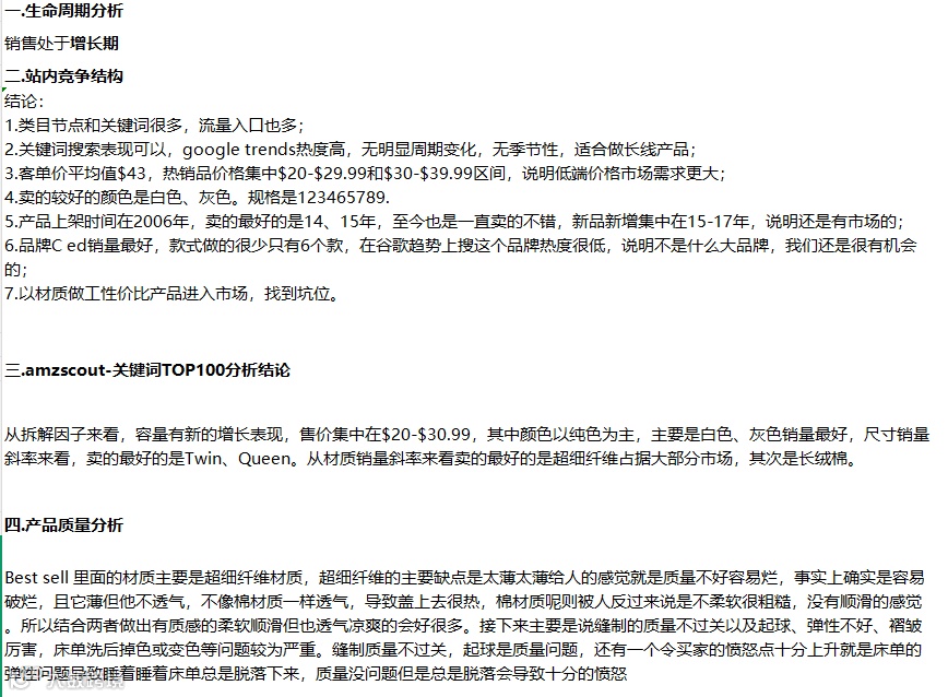 《亚马逊选品竞品分析表》全面解析床单套装市场,核心凸显$20-$39.99 价格带需求最高,灰色、白色成热门色。报告重点指出材质薄、不透气等用户痛点,给出 100 克重面料等优化方向。