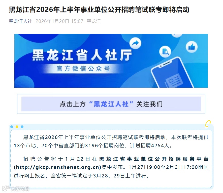 黑龙江省2026年上半年事业单位公开招聘笔试联考即将启动,本次联考将提供13个市地、20个中省直部门的3196个招聘岗位,计划招聘4254人。
