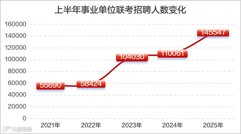 近年来,上半年事业单位联考呈现持续扩招趋势。2021年招聘人数约为5.5万,至2025年已增长至14万,增幅显著。据此趋势推测,2026年上半年联考招录规模预计可能达到15万人左右。
