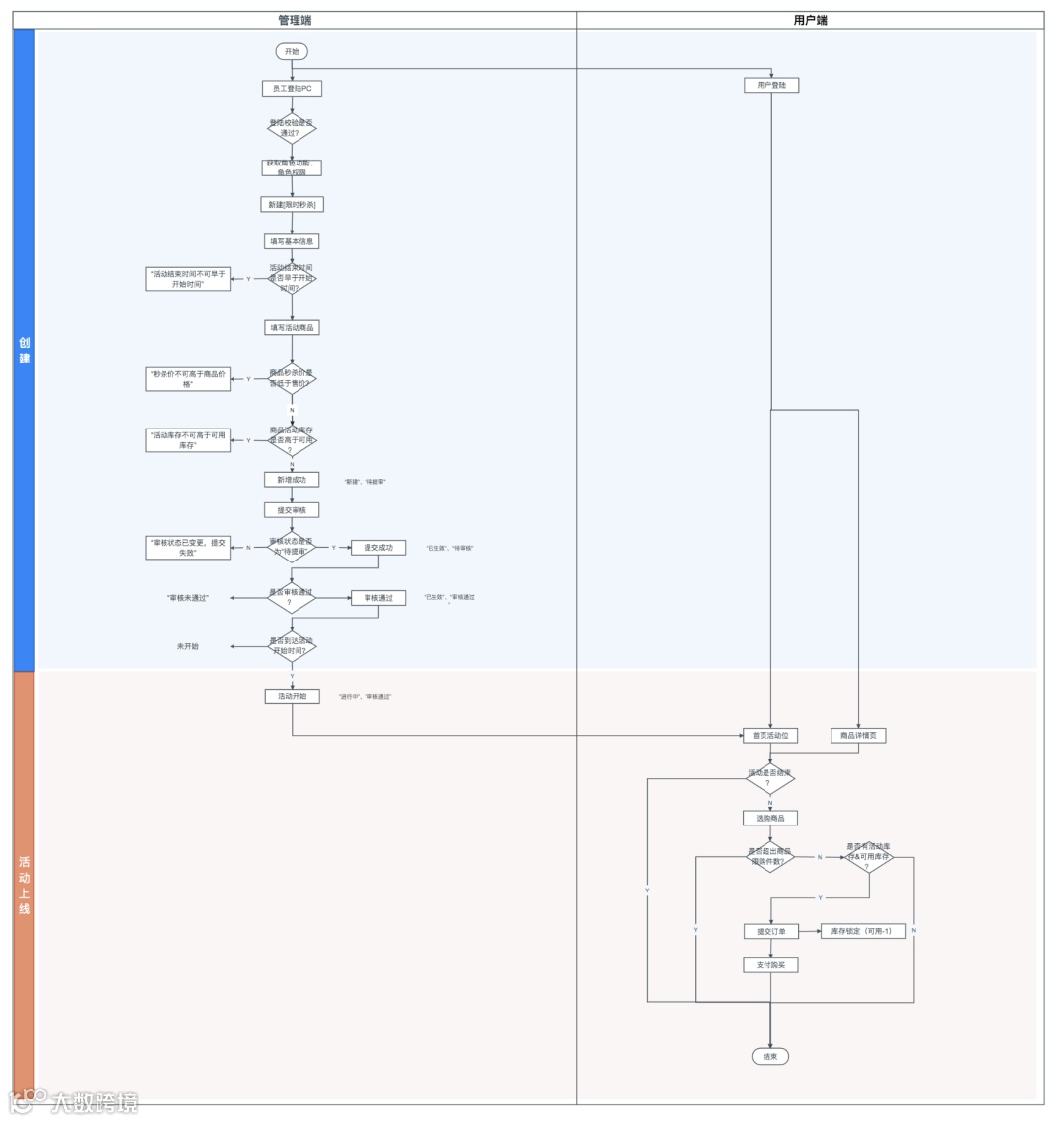 从“开始”开始,到“结束”结束,下图从管理端、用户端两个维度,对限时秒杀的创建-上线流程进行简单绘制。涵盖的功能包括: