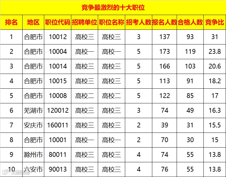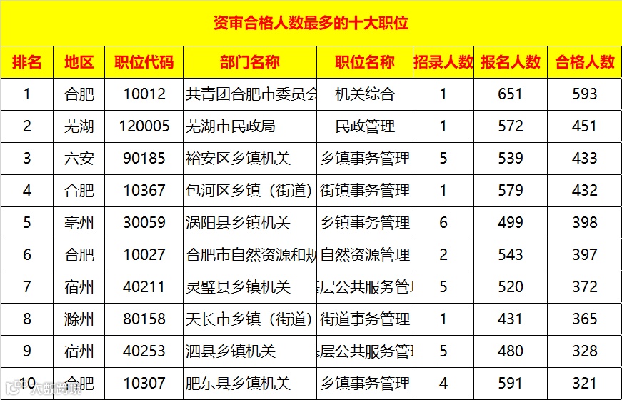 不出意外,前十岗位中,合肥地区占比较高,看来今年合肥的小伙伴们很洒脱就是笃定自己就要报考这个岗位了。友情提醒已经资格复审合格的小伙伴们,没有更改的机会,接下来的重点就是好好学习,奋力冲刺笔试啦!