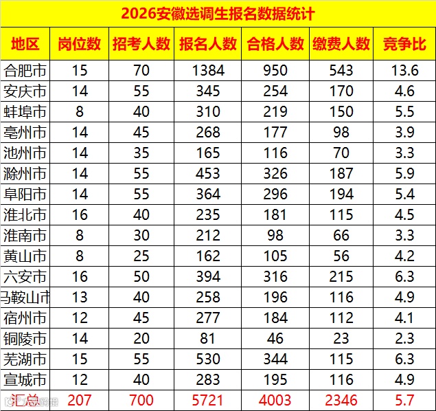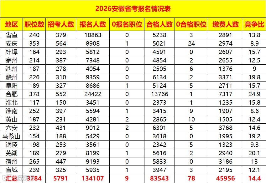 截至22日18时,2026安徽省考共134107人报名,资格审查合格83543人,其中45956人缴费,平均竞争比为14.4:1,职位最大竞争比是593:1。