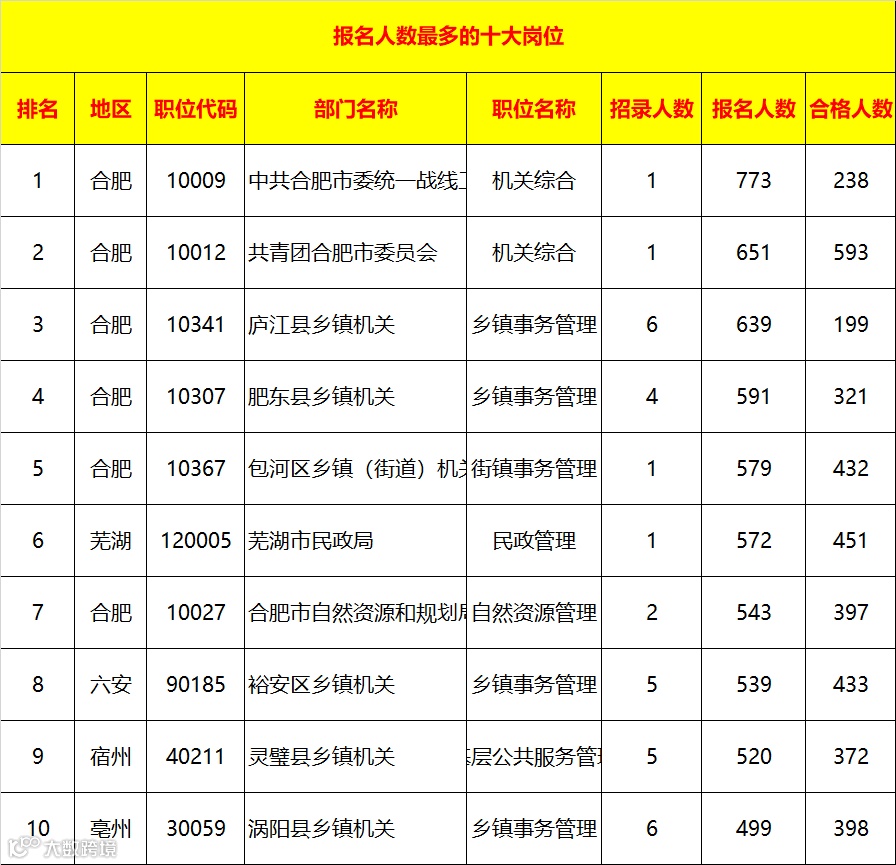 截至目前,【合肥市 -中共合肥市委统一战线工作】,报名人数最多,招聘1人,报名人数773人。【合肥-共青团合肥市委员会】其次,招录1人,报名人数为651人。【合肥-庐江县乡镇机关 】再次,招录6人,报名人数为639人。