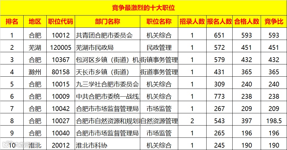目前排名靠前的职位为合肥市-共青团合肥市委员会-10012招1人,已有651人报名,竞争比593。