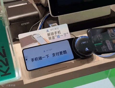 只要你的手机支持NFC功能并处于开启状态,店铺收银台也支持该功能。那么只要手机解锁并亮屏,然后在商家 NFC 收银设备感应区碰一下就能完成支付。