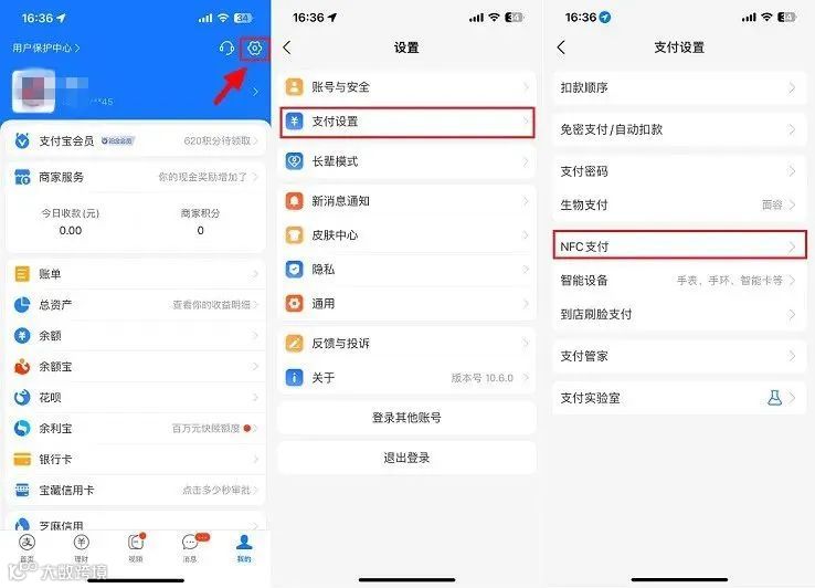 2、之后,将支付宝 APP 需升级到最新版本后,就可以在支付宝的“我的”-右上角的 “设置” -“支付设置” 中找到“NFC支付”了。