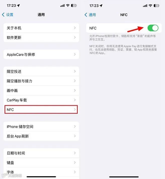 1、首先,进入 iPhone 的“设置” -“通用”-“NFC”,将开关调整为开启状态。值得一提的是,美版iPhone 的是 NFC 默认开启的,设置里没有选项。