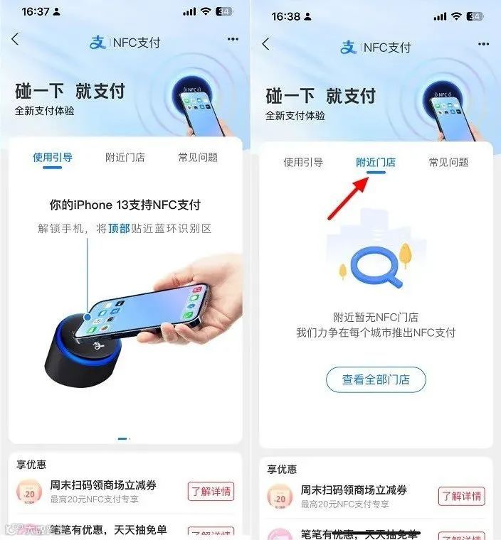 进入之后可以查看附近支持NFC支付的门店,不过,由于该功能刚上线,目前还只有小部分城市支持支付宝的 NFC 支付。