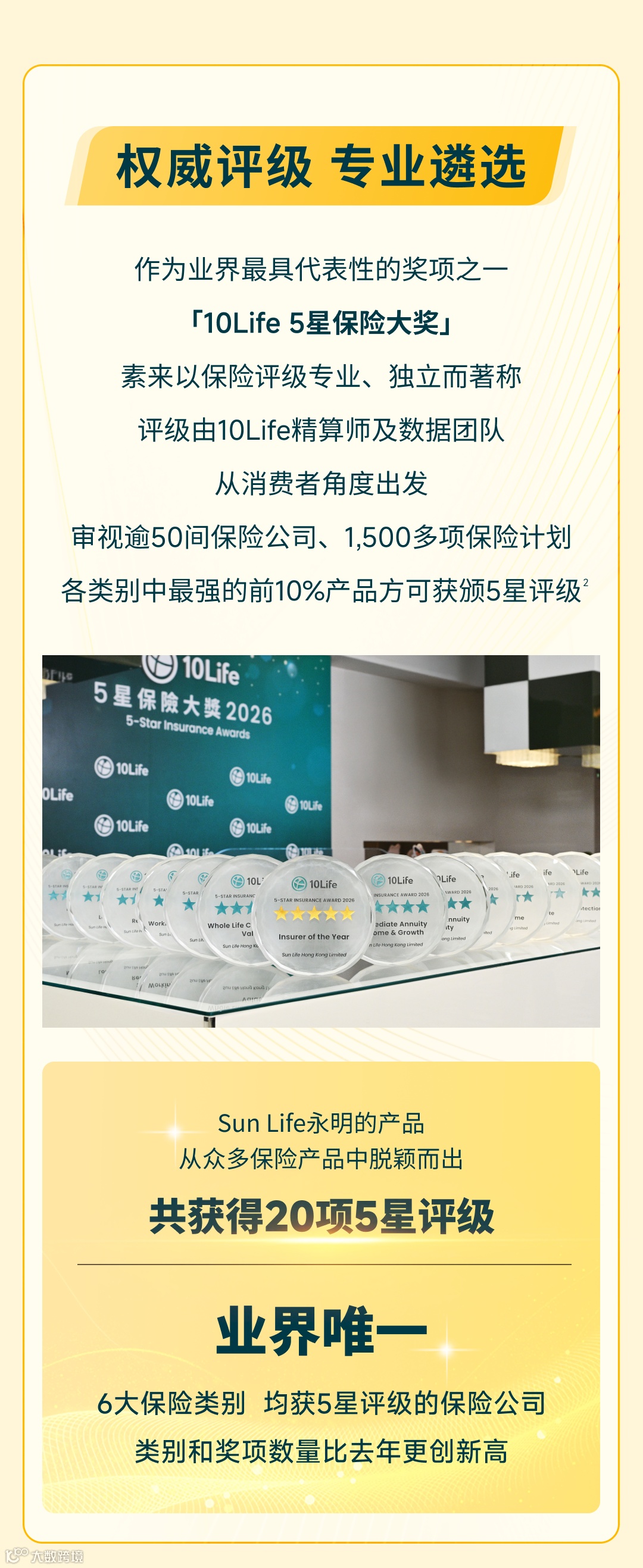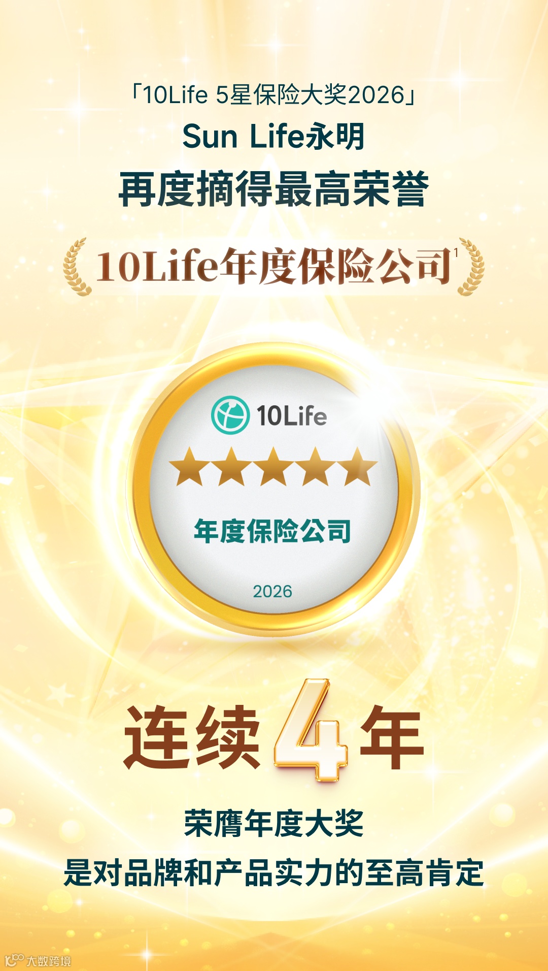 1.资料来源:10Life保险比较平台,Sun Life永明在10Life 5星保险大奖2026荣获年度保险公司大奖(截至2026年1月2日)。详情:www.10Life.com