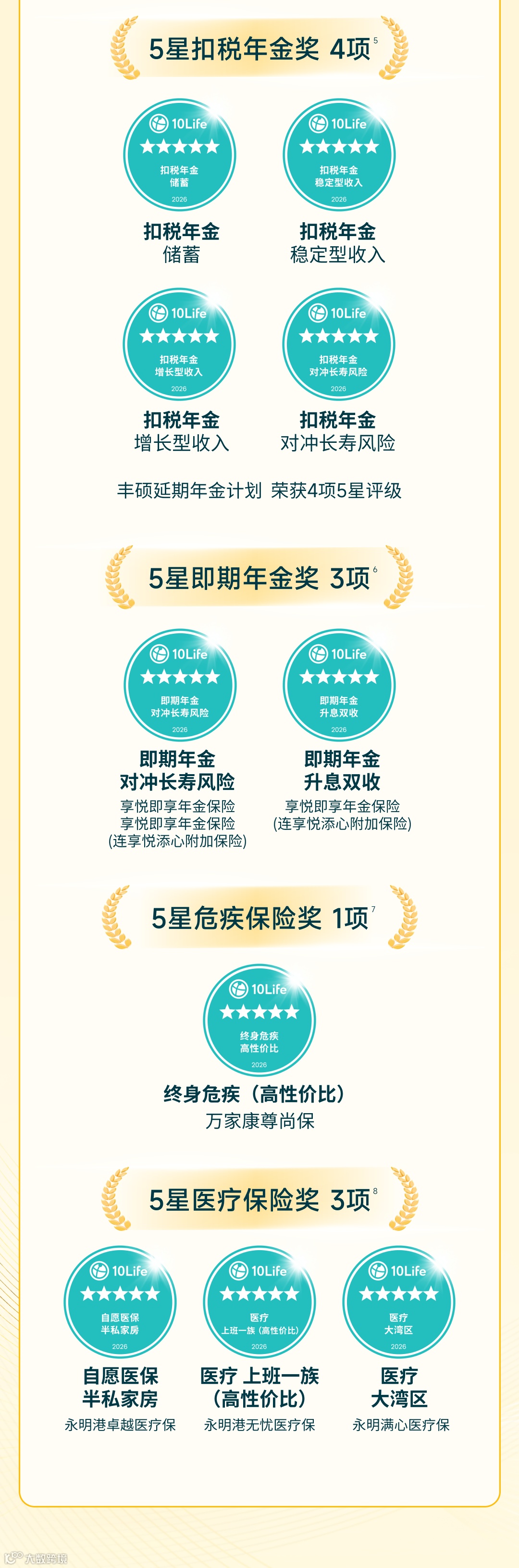 8.资料来源:10Life保险比较平台,永明港卓越医疗保在10Life 5星保险大奖2026荣获5星医疗保险奖(自愿医保 半私家房),永明港无忧医疗保在10Life 5星保险大奖2026荣获5星医疗保险奖(上班一族 高性价比),永明满心医疗保在10Life 5星保险大奖2026荣获5星医疗保险奖(大湾区)(截至2026年1月2日)。详情:www.10Life.com
