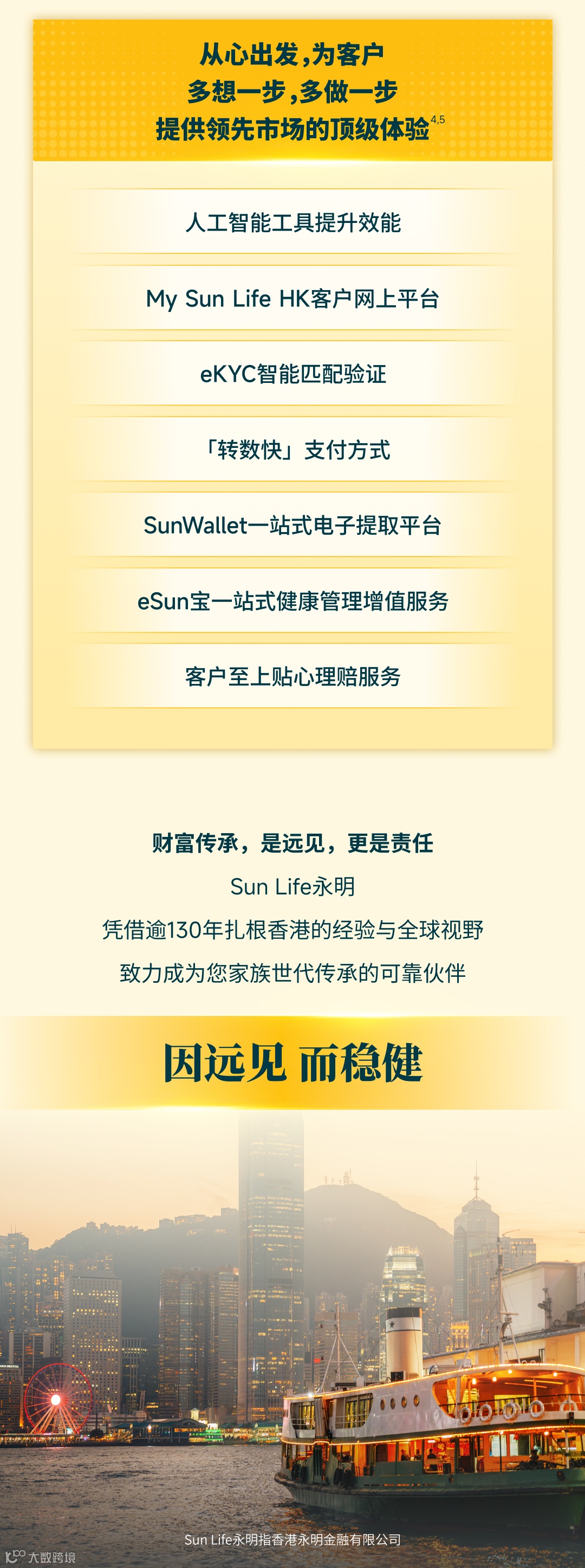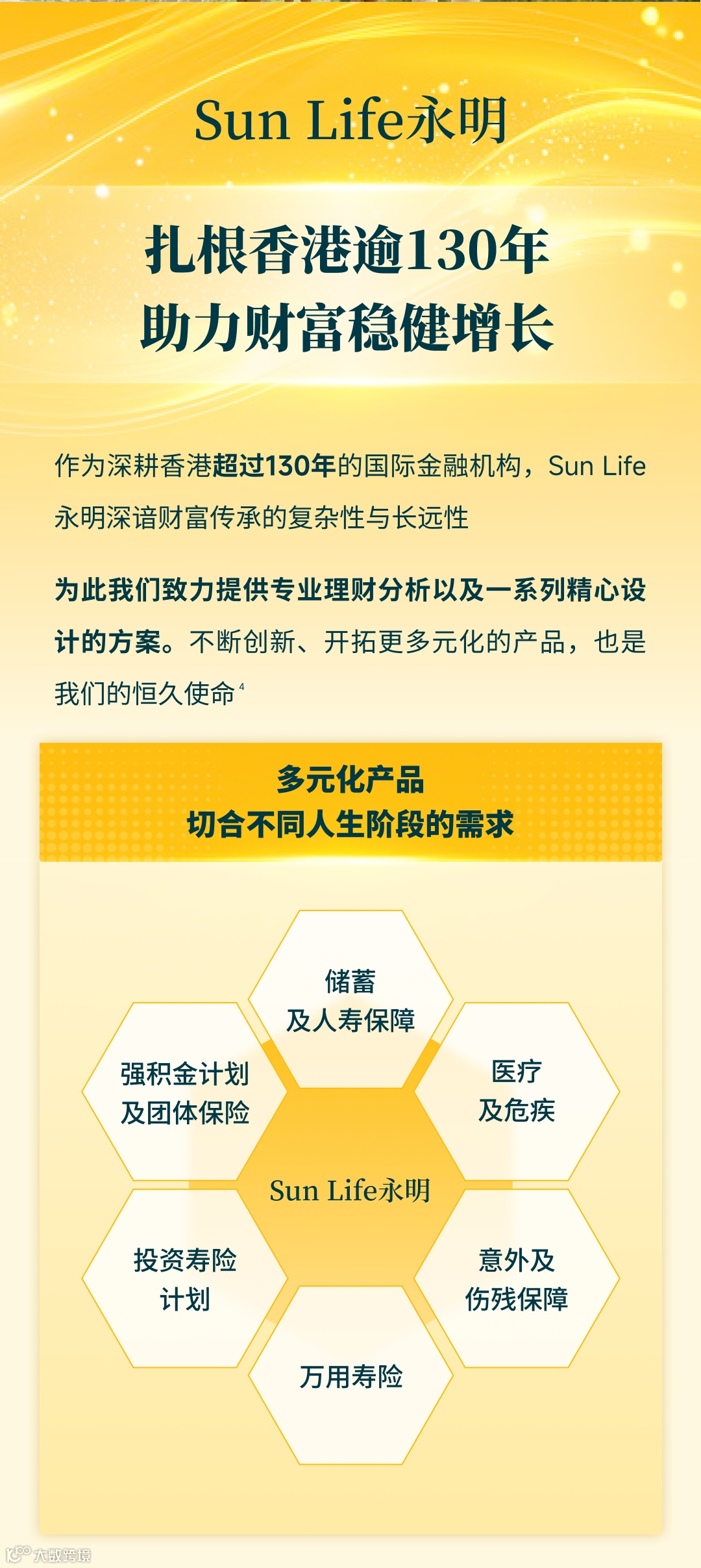 此微信公众号/本文章所有资料只作为一般参考之用,所有资料并非任何形式之保证或专业意见,既不构成任何推荐、提议或请求(无论是投资或其他决定),亦不可作为任何协议出售或购买任何产品的根据。香港永明金融有限公司(“Sun Life永明”) 不对上述资料的准确性和可靠性所导致的后果负责。Sun Life永明一概不因他人使用或诠释以上之任何资料而承担任何责任。本文章旨在香港派发,并不能诠释为在香港境外提呈销售、游说购买或提供任何Sun Life永明的产品。投资涉及风险。阁下在做出任何投资选择前,应考虑个人可承受的风险程度及财务状况。在选择保险产品时,如阁下对某保险产品是否适合自己存在疑问(包括是否符合阁下的投资目标),阁下应寻求独立财务及/或专业意见,并须考虑个人情况而作出最适合自己的保险产品选择。