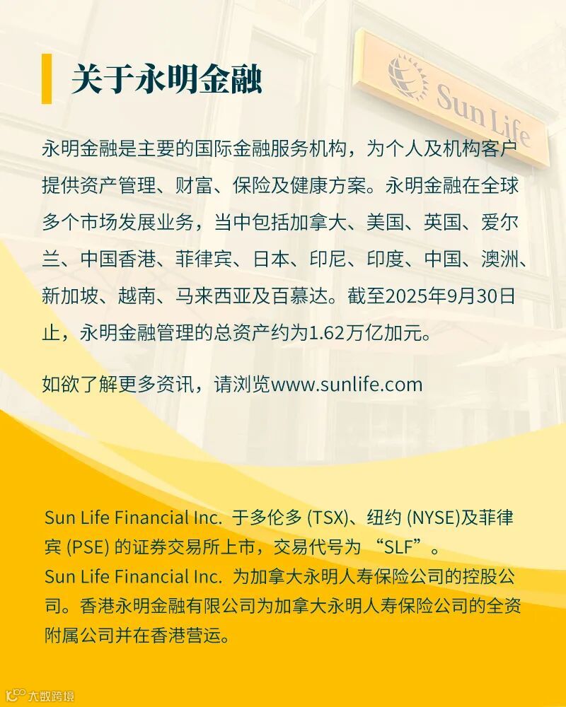 此微信公众号/本文章所有资料只作为一般参考之用,所有资料并非任何形式之保证或专业意见,既不构成任何推荐、提议或请求(无论是投资或其他决定),亦不可作为任何协议出售或购买任何产品的根据。香港永明金融有限公司(“Sun Life永明”) 不对上述资料的准确性和可靠性所导致的后果负责。Sun Life永明一概不因他人使用或诠释以上之任何资料而承担任何责任。本文章旨在香港派发,并不能诠释为在香港境外提呈销售、游说购买或提供任何Sun Life永明的产品。投资涉及风险。阁下在做出任何投资选择前,应考虑个人可承受的风险程度及财务状况。在选择保险产品时,如阁下对某保险产品是否适合自己存在疑问(包括是否符合阁下的投资目标),阁下应寻求独立财务及/或专业意见,并须考虑个人情况而作出最适合自己的保险产品选择。
