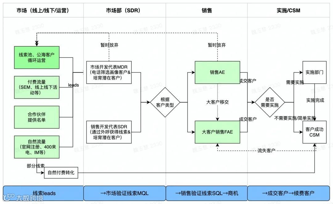 其中市场SDR团队负责线索的获取、清洗、培育、再移交接给销售进行促进签单,签单后移交给客户成功团队进行实施和后续的服务。