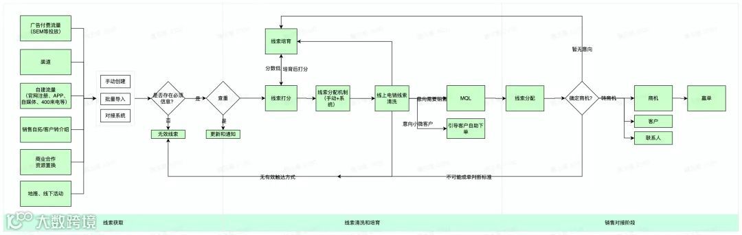 “认知——流量——线索——MQL——SQL——商机——成交——增购复购/转介绍”是SAAS团队的全链路营销漏斗,那么所谓的线索模块涉及的是“认知——流量——线索——MQL”的部分。