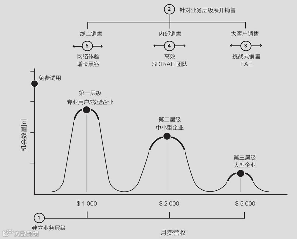 如图所示,SAAS公司的客户可以分为三级,每个公司有可能涉及1~3个等级的客户,组织的建立是需要根据客户层级确定的。小微型客户需要的市场和销售团队的职责和中大型客户的并不一致。