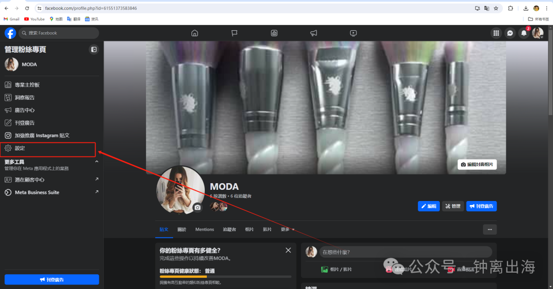 1.找到上广告的时候选择的这个公共主页,然后跟着我红色的框框箭头提示操作,打开设置