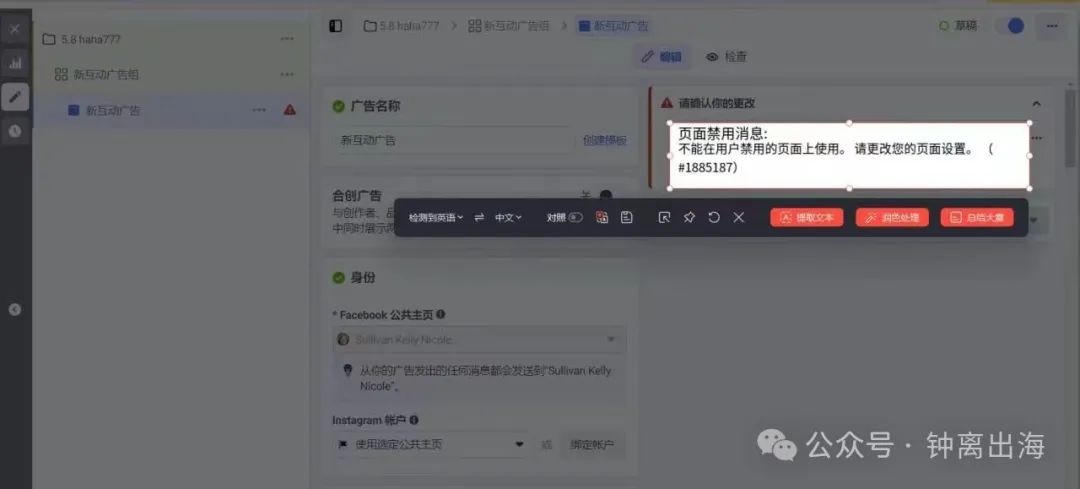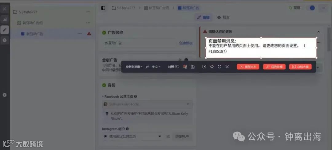 在上广告的时候难免会遇到一些小小的问题或者bug,接下来我们需要学习的就是解决上广告提示“公共主页消息功能已禁用:“发消息"行动号召不适用于已禁用消息功能的公共主页,请更改公共主页设置” 如下图所示提示