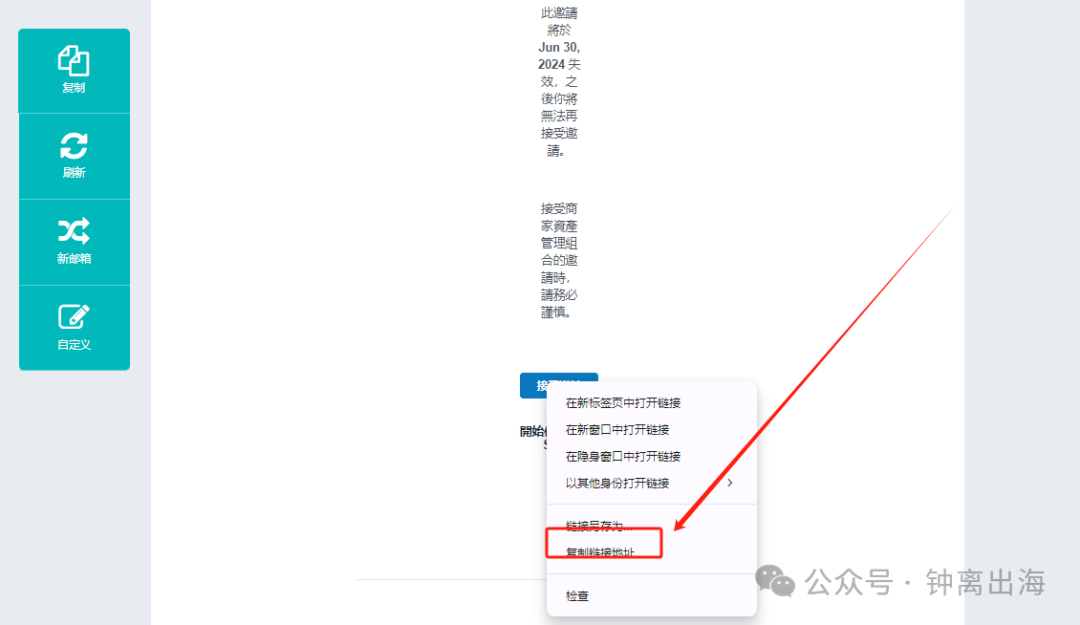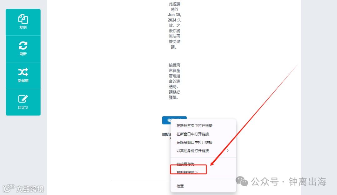 4.在你的邮箱里面打开邀请链接,把鼠标放在蓝色字体那,右键复制地址,把链接复制下来,复制的链接拿去给个人账号接入
