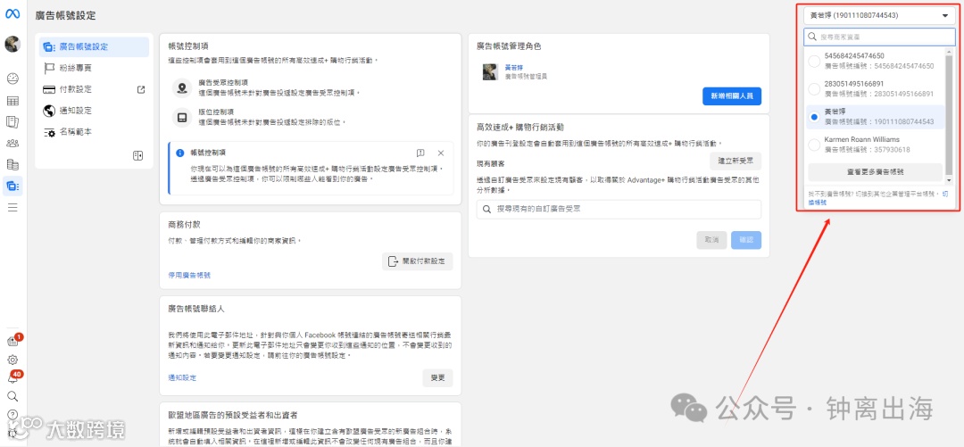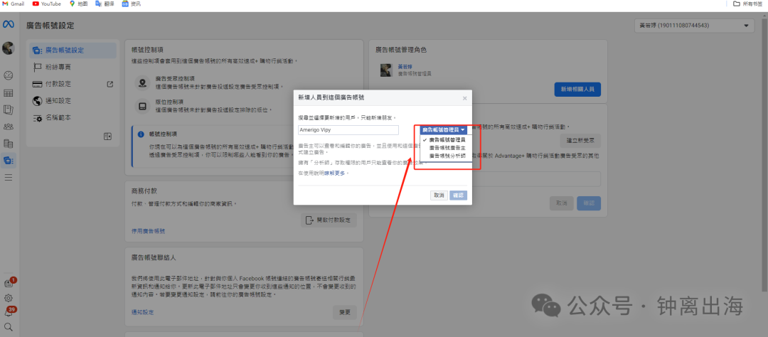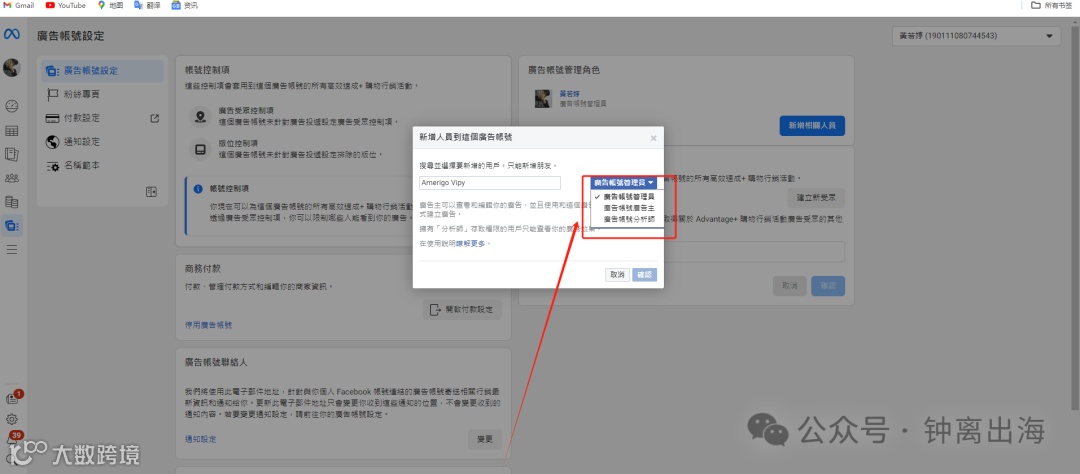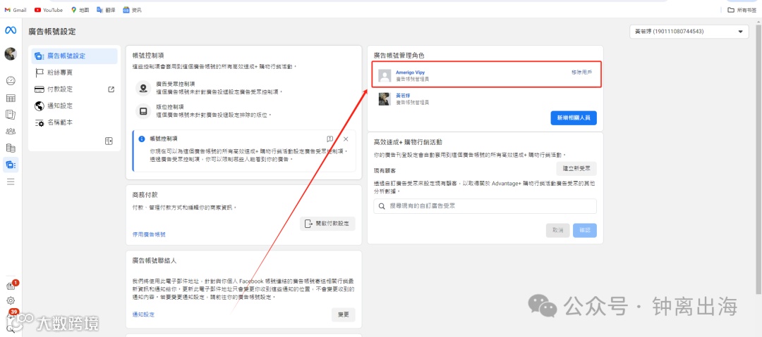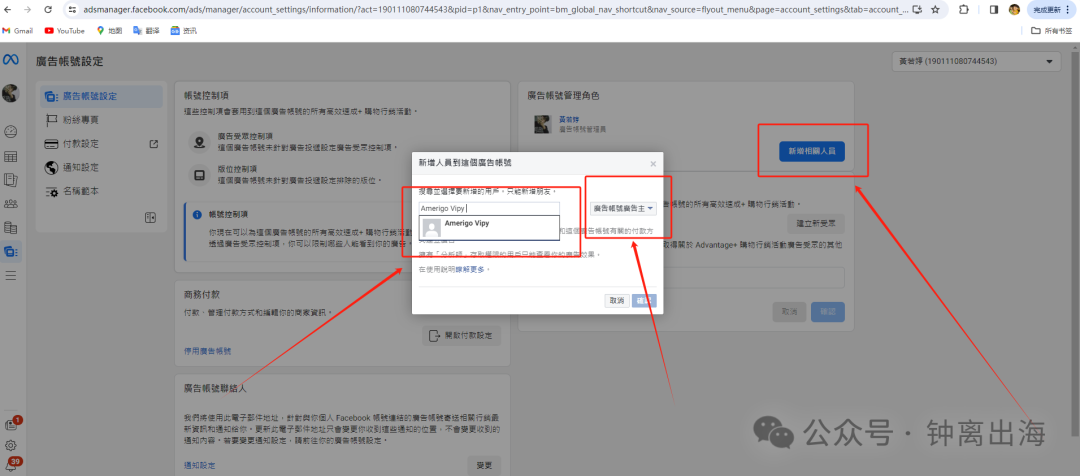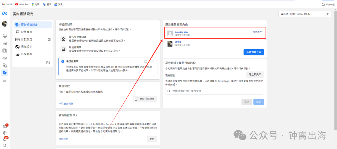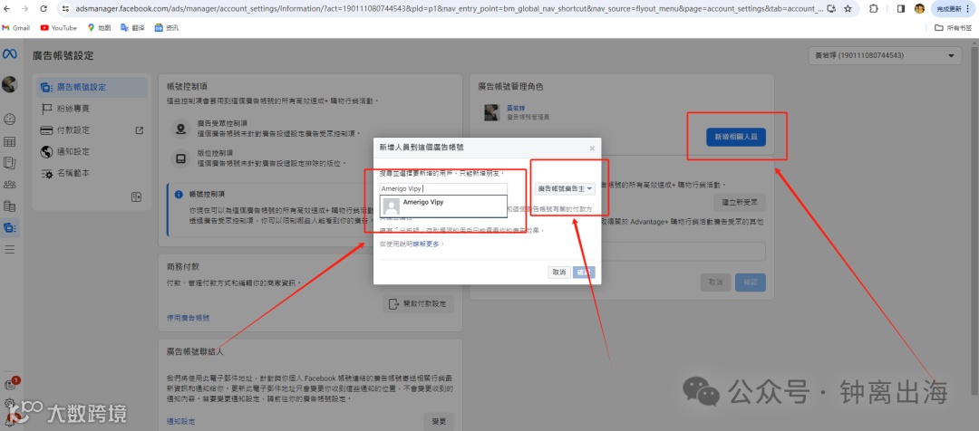 6.复制需要备份的个人号的名字,到广告账户设置里添加管理员身份。