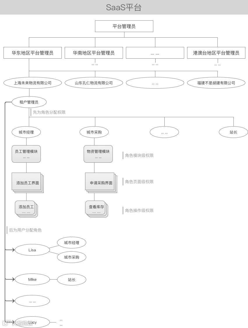 一般SaaS平台基本角色由平台管理员、租户用户、租户管理员、租户其他角色组成。下图以O2O业务的企业架构为例,图解系统角色关系。
