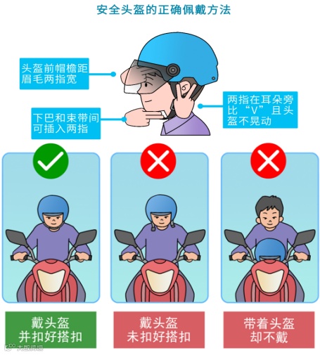 安全头盔是骑乘人员的重要安全防线,骑行时一定要正确佩戴,千万不要不戴或者虚戴不系卡扣,虚戴头盔等于未戴,碰撞时头盔会瞬间飞出,无法保护头部。