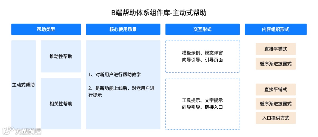 我们可以基于产品界面的帮助指引分出三种形式:主动式帮助、被动式帮助、自动式帮助。基于这三种帮助形式设计相应合适的交互形式与内容组织形式,进而形成标准化的组件库。